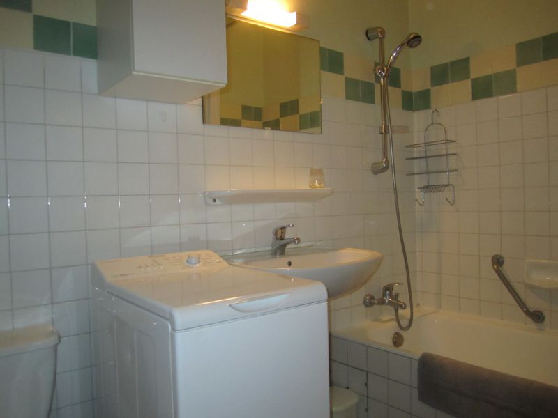 Salle de bains avec baignoire, lave-linge et toilettes.