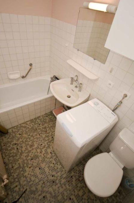 - Salle de bains avec baignoire, lavabo, WC et lave-linge.