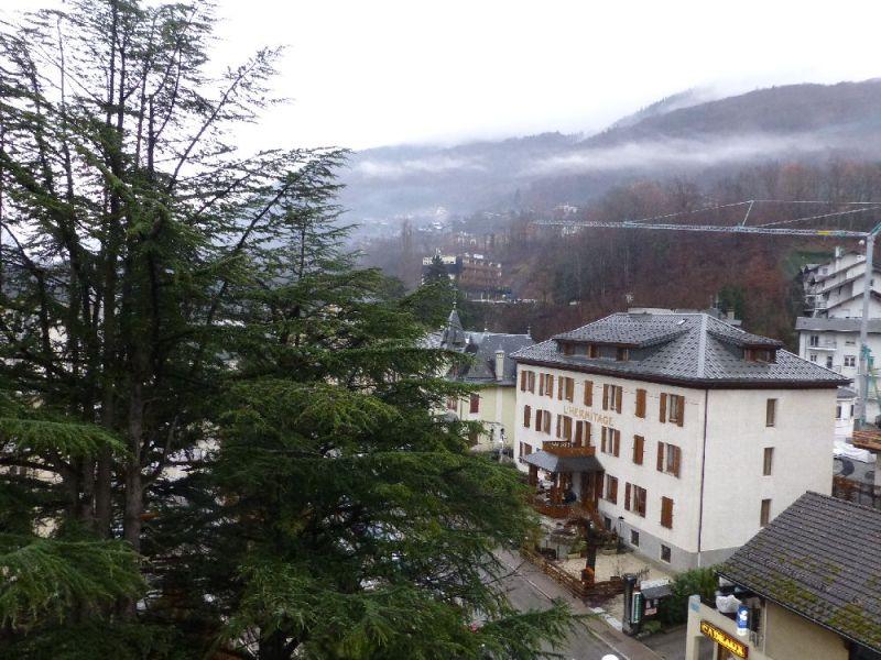 Vue sur l'esplanade des thermes, le parc thermal et sur la montagne.