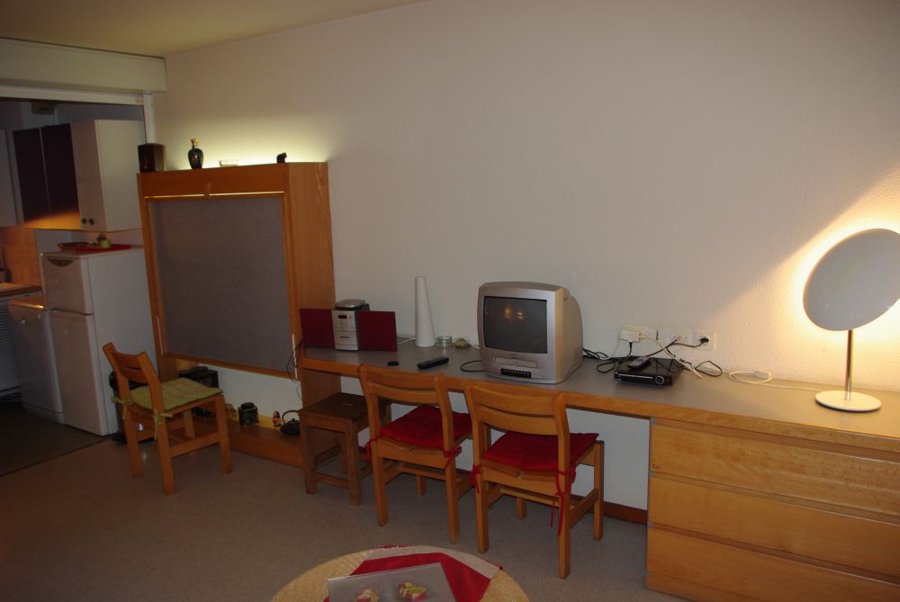 - Pièce à vivre: Coin repas, 1 lit double (2 pers 140X190) , rangements, télévision.