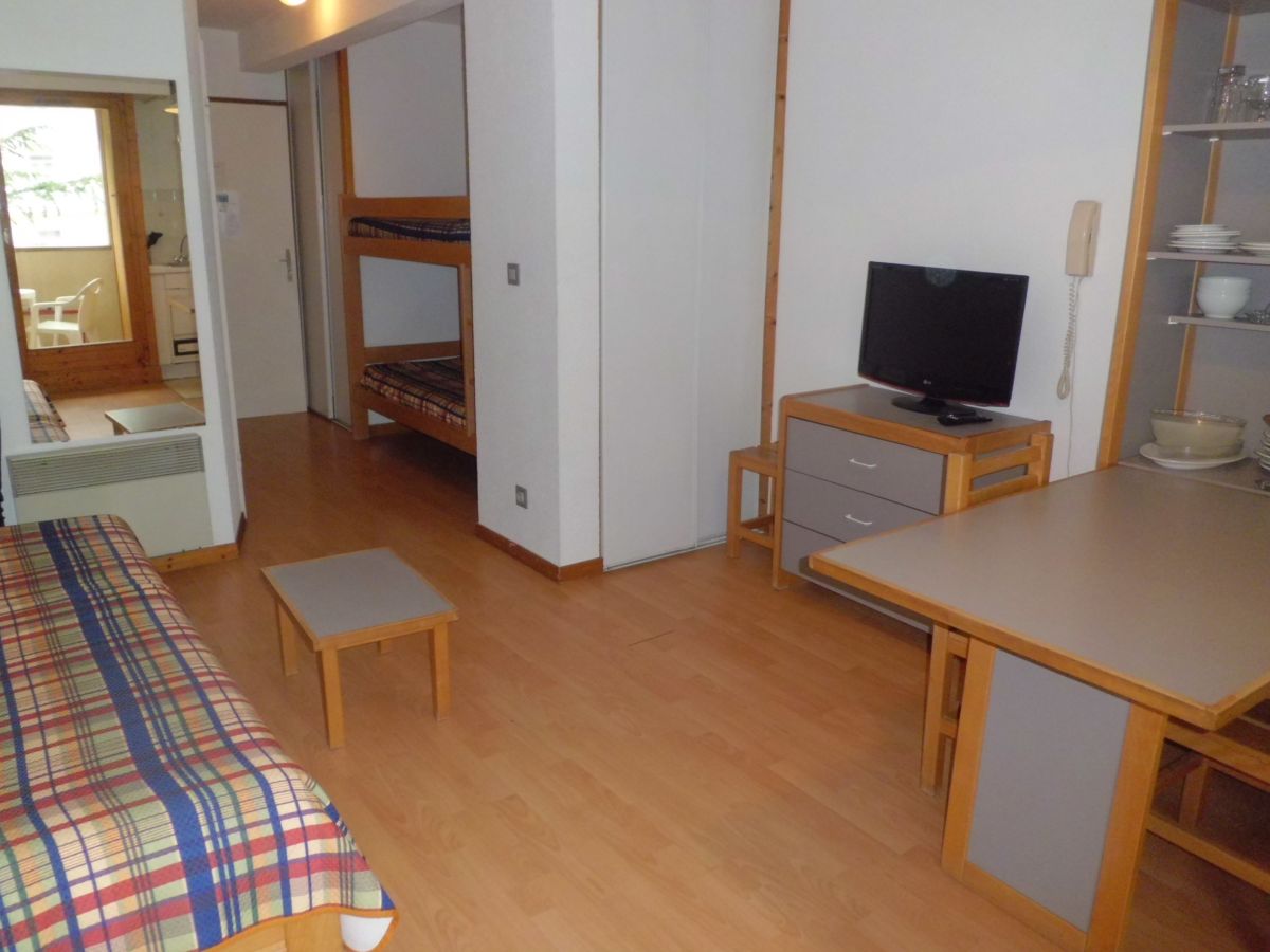 - Pièce à vivre : Coin repas, lits gigognes (2 pers), rangements, télévision.