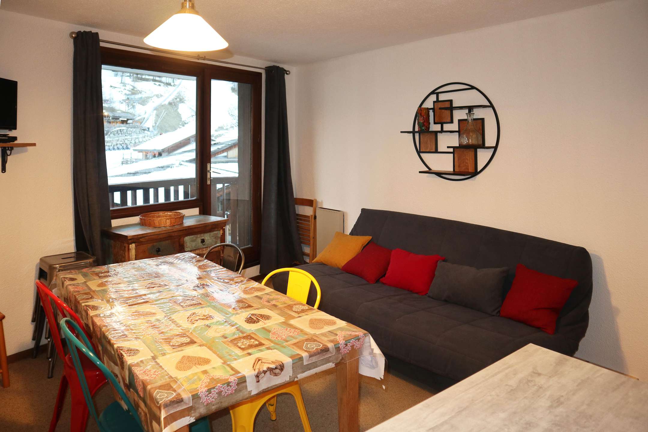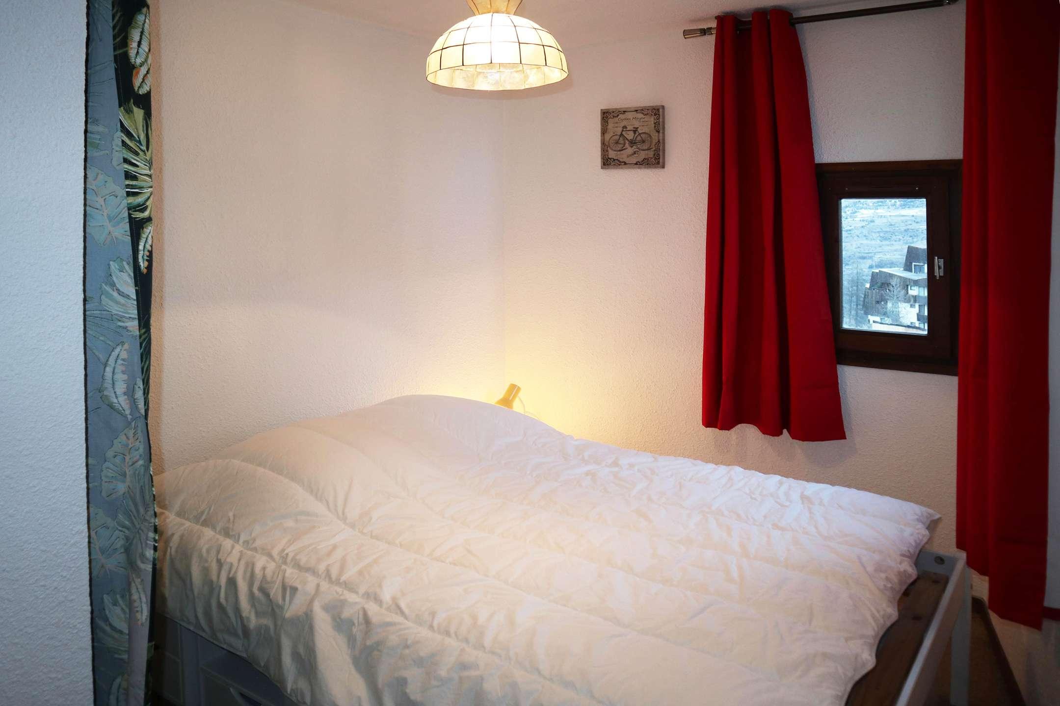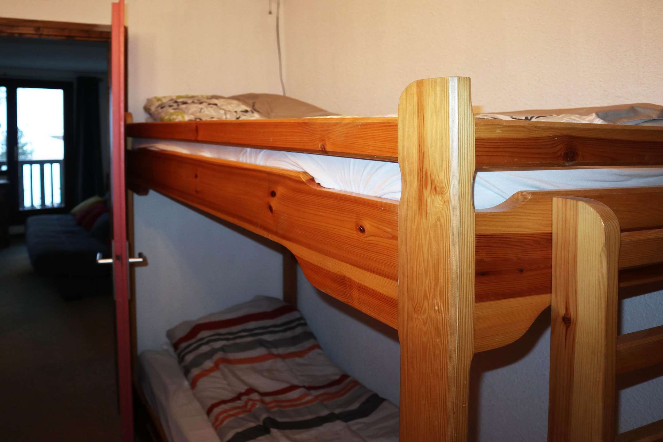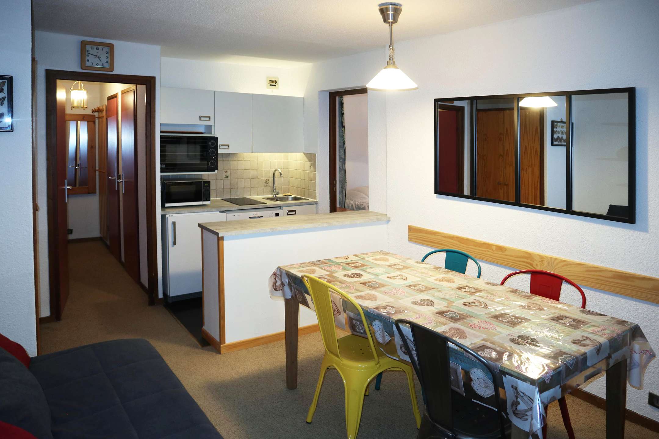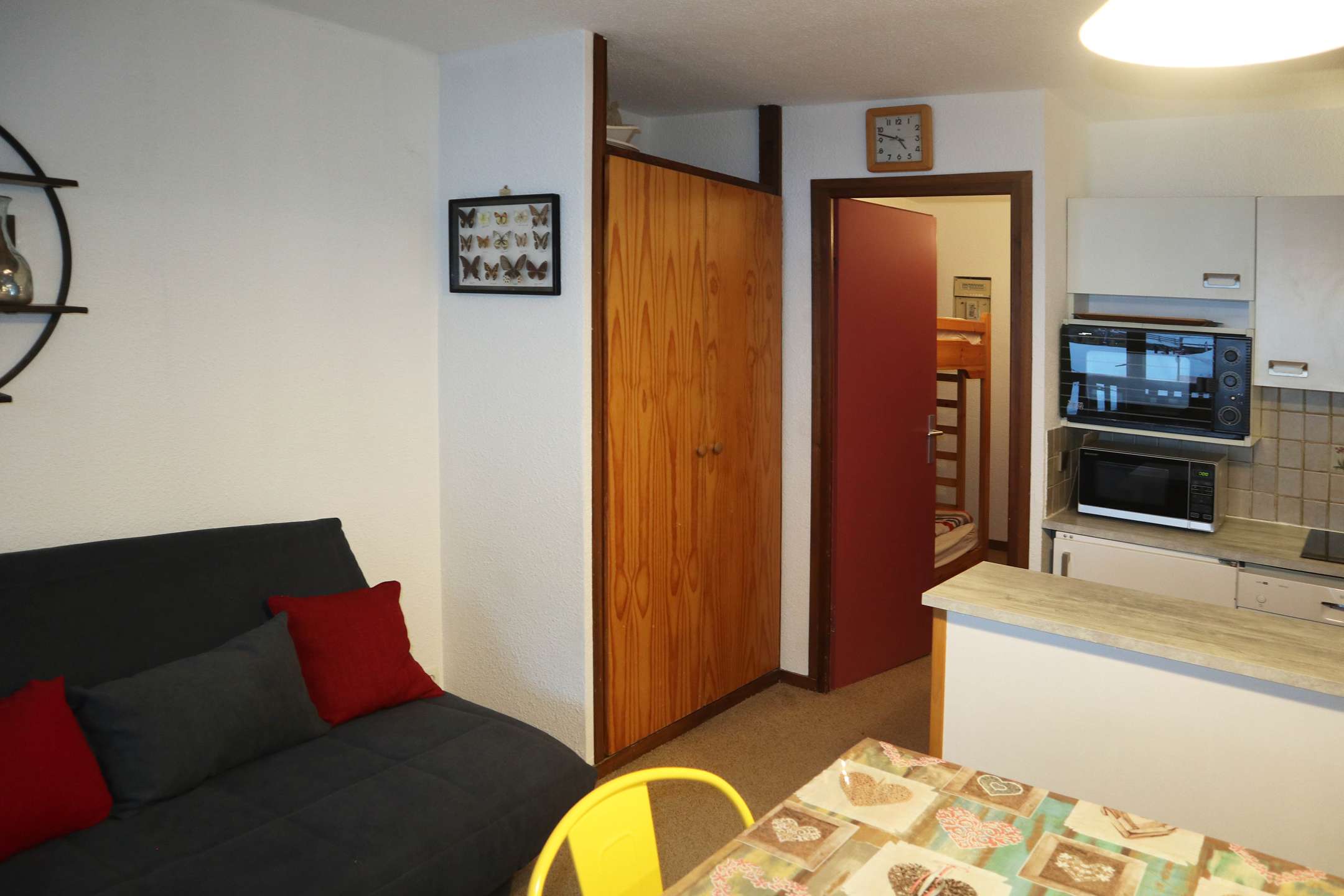 Résidence le cairn située en cœur de station avec accès direct aux pistes et commerces, appartement de type 2 pièces équipé pour 6 personnes composé d'une entrée avec 2 lits superposés 1 place, séjour avec 1 banquette convertible 2 places, chambre avec 1 lit 2 places, salle de bains et wc indépendants, coin cuisine ouvert sur le séjour.