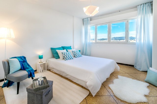 1 chambre de maître avec un lit double, canapé lit convertible, balcon, salle de bains et toilettes.