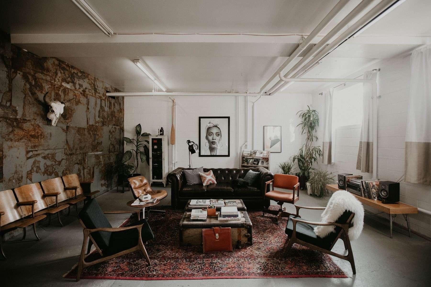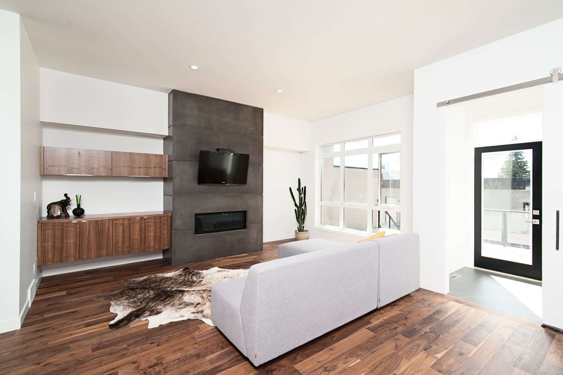 séjour avec terrasse, lit de repos et cheminée panoramique à foyer fermé